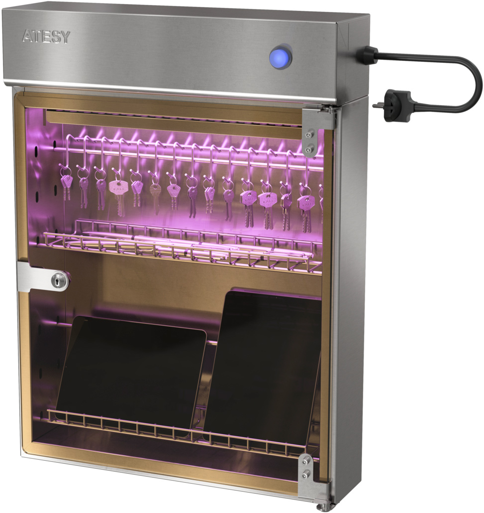 Стерилизатор смартфонов и гаджетов Atesy СТС-1-02-1 применяется для обеззараживания поверхностей сотовых телефонов, планшетов, а также канцелярских товаров и связок ключей, за счет воздействия ультрафиолетового излучения на предприятиях общественного питания и торговли. Дверь с замком и электронным таймером на 1 мин. Полки и вешалки в комплект не входят и приобретаются отдельно.