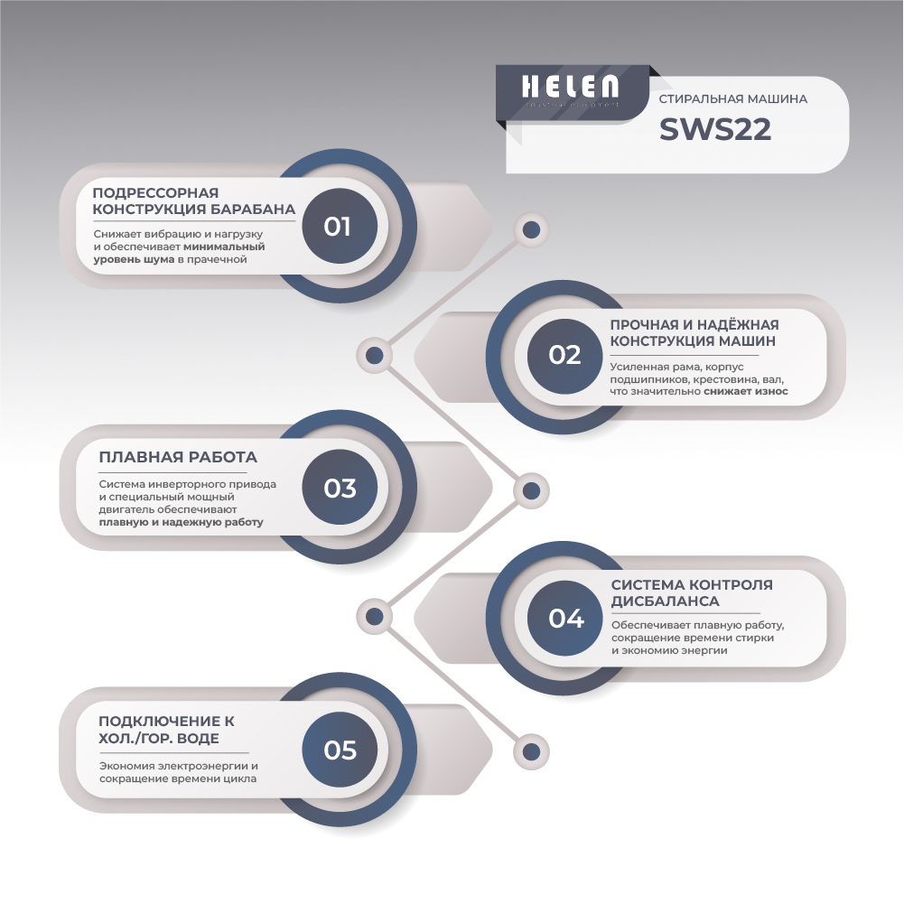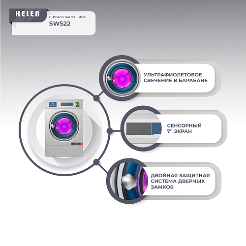 Стирально-отжимная машина HELEN SWS22 используется в прачечных, гостиницах, больницах, ресторанах и других предприятиях сферы обслуживания.