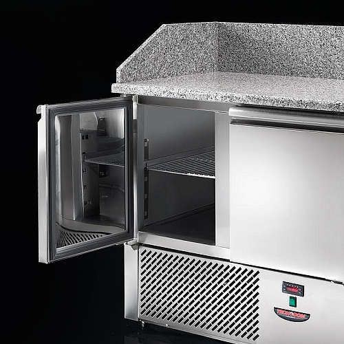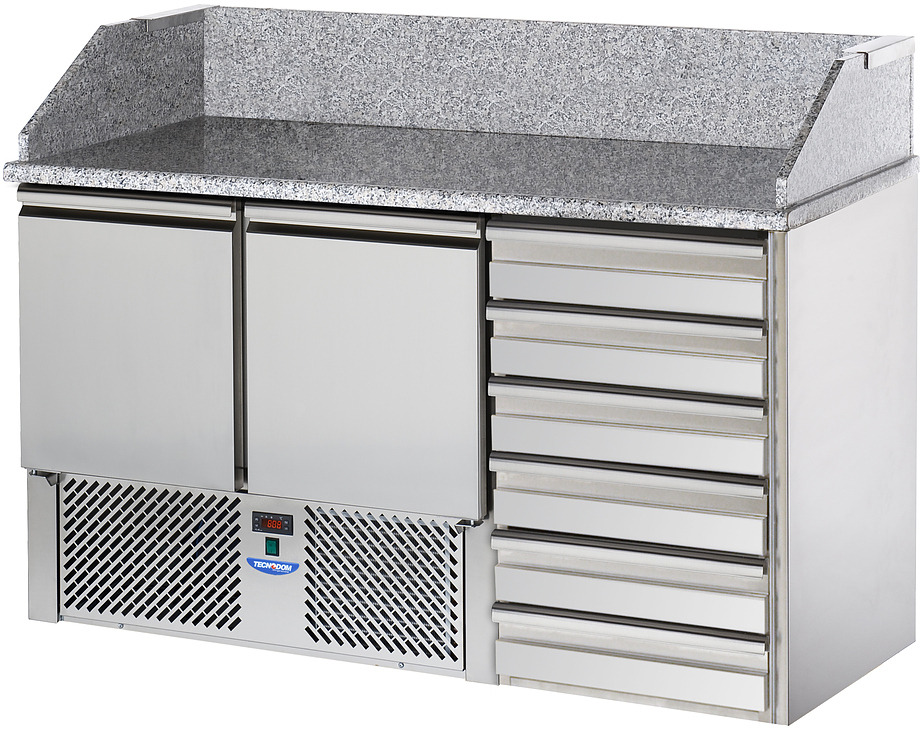 Стол для пиццы охлаждаемый TECNODOM SLV02C6 используется на предприятиях общественного питания и торговли для раскатки теста и обработки ингредиентов, используемых для приготовления пиццы, салатов и других блюд, а также для охлаждения и кратковременного хранения скоропортящихся продуктов и напитков. Модель оснащена электронной панелью управления с NTC датчиком, столешницей с бортом и 6 нейтральными ящиками с контейнерами из полипропилена. Корпус, за исключением агрегатного отсека, выполнен из нержавеющей стали, столешница - из гранита, теплоизоляция - полиуретан, впрыскиваемый под высоким давлением.