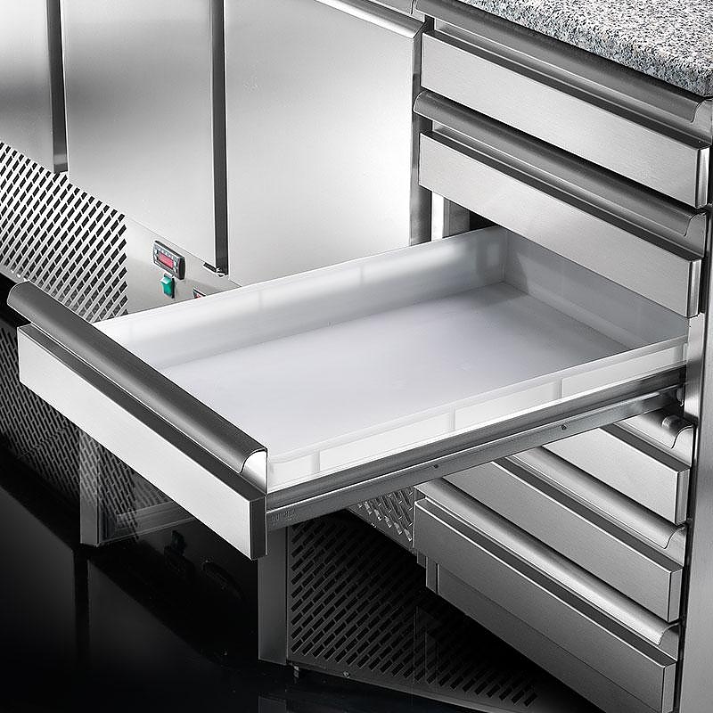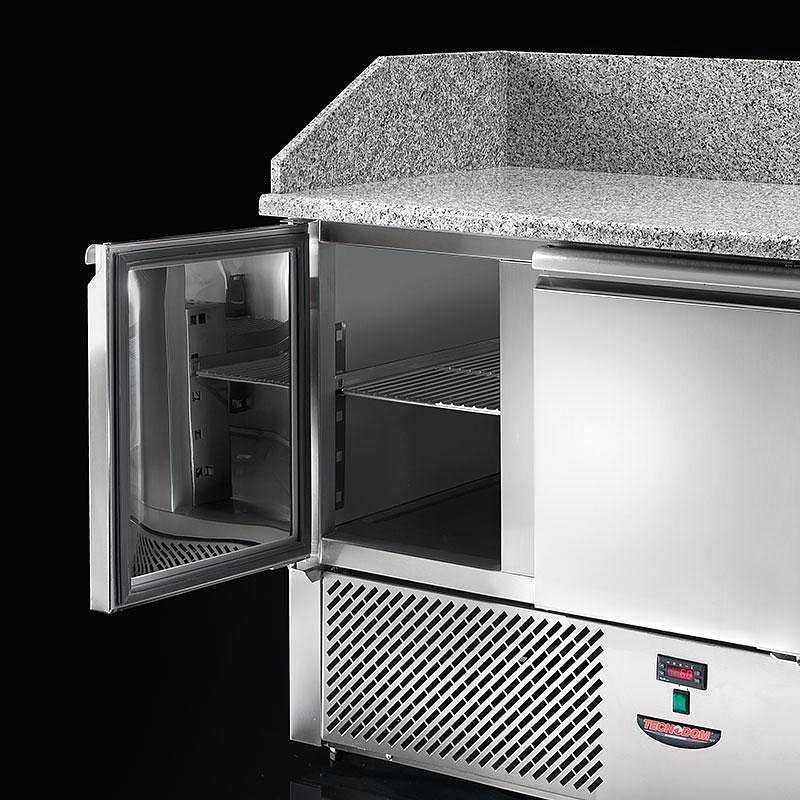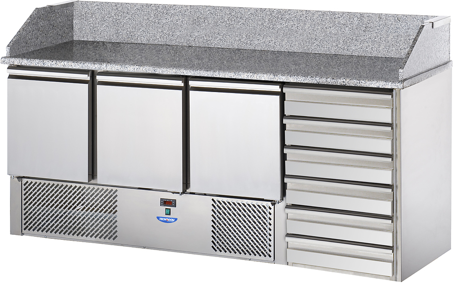 Стол для пиццы охлаждаемый TECNODOM SLV03C6 используется на предприятиях общественного питания и торговли для раскатки теста и обработки ингредиентов, используемых для приготовления пиццы, салатов и других блюд, а также для охлаждения и кратковременного хранения скоропортящихся продуктов и напитков. Модель оснащена электронной панелью управления с NTC датчиком, столешницей с бортом и 6 нейтральными ящиками с контейнерами из полипропилена. Корпус, за исключением агрегатного отсека, выполнен из нержавеющей стали, столешница - из гранита, теплоизоляция - полиуретан, впрыскиваемый под высоким давлением.