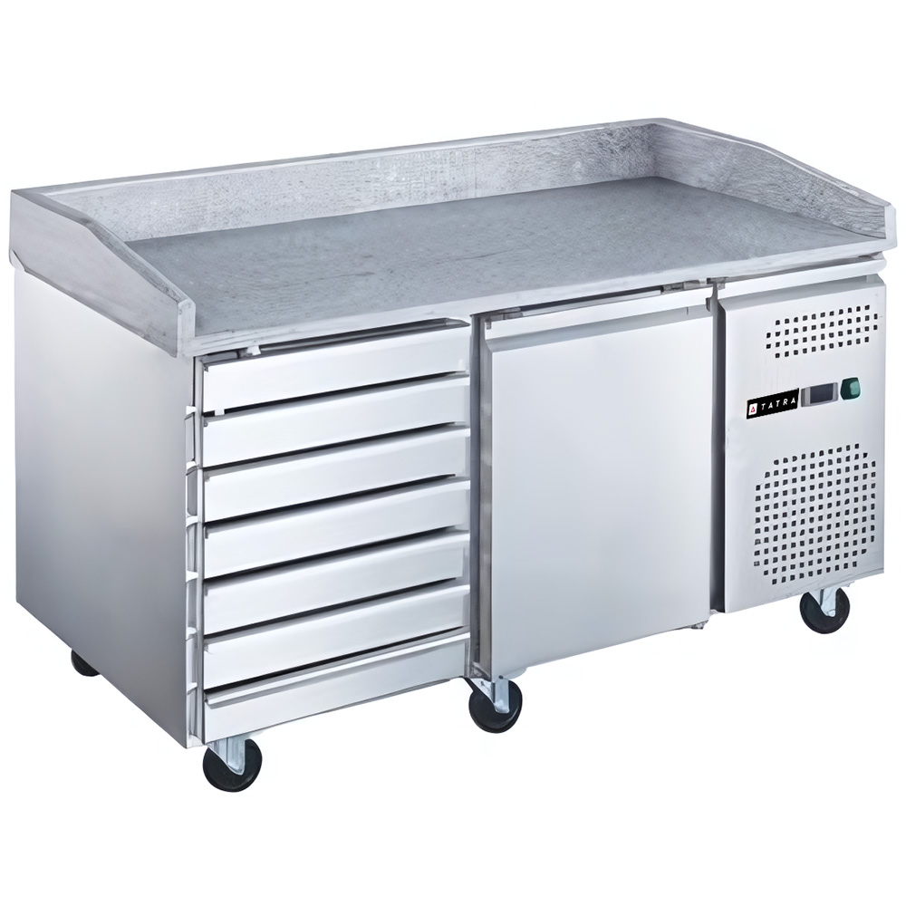 Стол для пиццы TATRA TPZEN1D7 STB каменная столешница предназначен для использования в торговых точках и заведениях общественном питании. Он оборудован встроенным холодильным агрегатом, расположенным сбоку и динамической системой охлаждения, что обеспечивает эффективное и равномерное охлаждение всех продуктов на полках.
