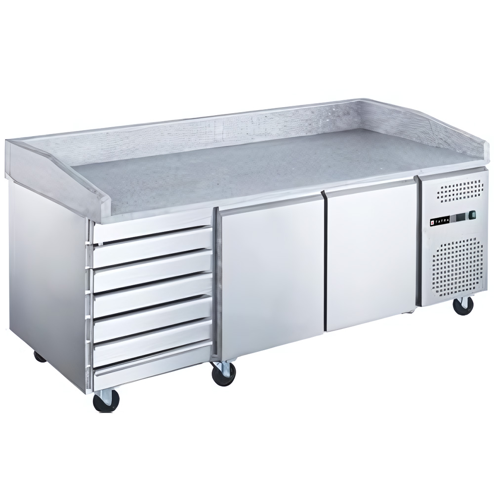 Стол для пиццы TATRA TPZEN2D7 STB каменная столешница предназначен для использования в торговых точках и заведениях общественном питании. Он оборудован встроенным холодильным агрегатом, расположенным сбоку и динамической системой охлаждения, что обеспечивает эффективное и равномерное охлаждение всех продуктов на полках.