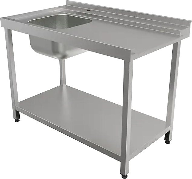 Стол для посудомоечной машины входной КОБОР СПМ/2-120/70/Л используется на предприятиях общественного питания и торговли. Модель оснащена бортом, отверстием под смеситель и полкой в нижней части. Сварной каркас выполнен из нержавеющей трубы, столешница - из нержавеющей стали AISI 430, усиление - из ЛДСП.