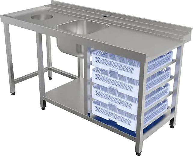 Стол для посудомоечной машины входной КОБОР СПМ/2-170/70/Л используется на предприятиях общественного питания и торговли. Модель оснащена бортом, отверстием под смеситель, полкой в нижней части, отверстием для сбора отходов и 4 уровнями направляющих для посудомоечных кассет. Сварной каркас выполнен из нержавеющей трубы, столешница - из нержавеющей стали AISI 430, усиление - из ЛДСП.