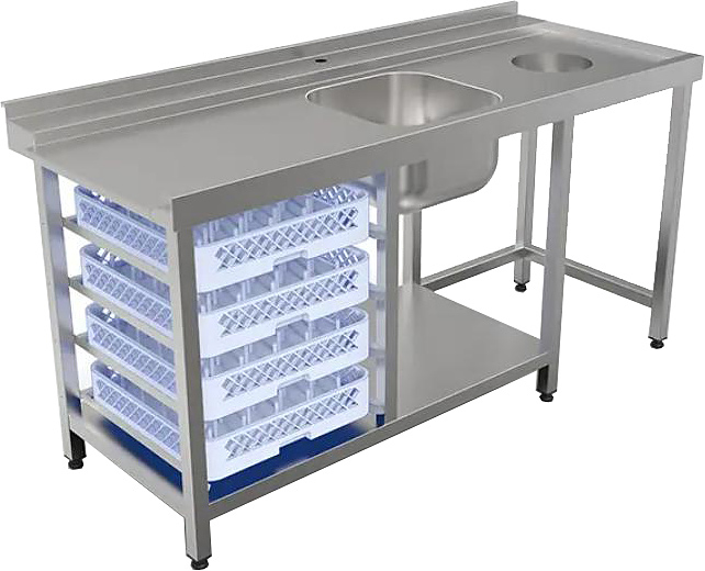 Стол для посудомоечной машины входной КОБОР СПМ/2-170/70/П используется на предприятиях общественного питания и торговли. Модель оснащена бортом, отверстием под смеситель, полкой в нижней части, отверстием для сбора отходов и 4 уровнями направляющих для посудомоечных кассет. Сварной каркас выполнен из нержавеющей трубы, столешница - из нержавеющей стали AISI 430, усиление - из ЛДСП.