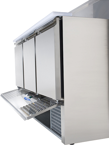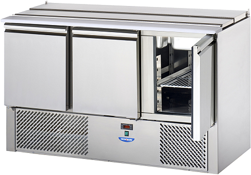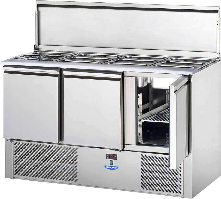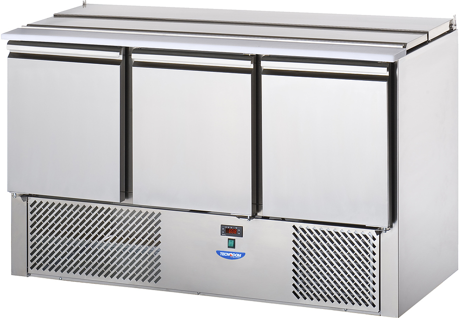 Стол для салатов охлаждаемый TECNODOM SLV03EKO используется на предприятиях общественного питания и торговли для обработки ингредиентов, используемых для приготовления пиццы, салатов и других блюд, а также для охлаждения и кратковременного хранения скоропортящихся продуктов и напитков. Модель оснащена электронной панелью управления с NTC датчиком, крышкой и бортом из полиэтилена. Корпус, за исключением агрегатного отсека, и крышка выполнены из нержавеющей стали, теплоизоляция - полиуретан, впрыскиваемый под высоким давлением.