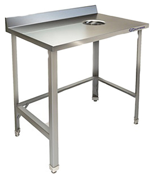 Состоит из столешницы из пищевой нержавеющей стали с отверстием диаметром 180 мм в центре столешницы с направляющей горловиной, смещенной влево или вправо по желанию заказчика.