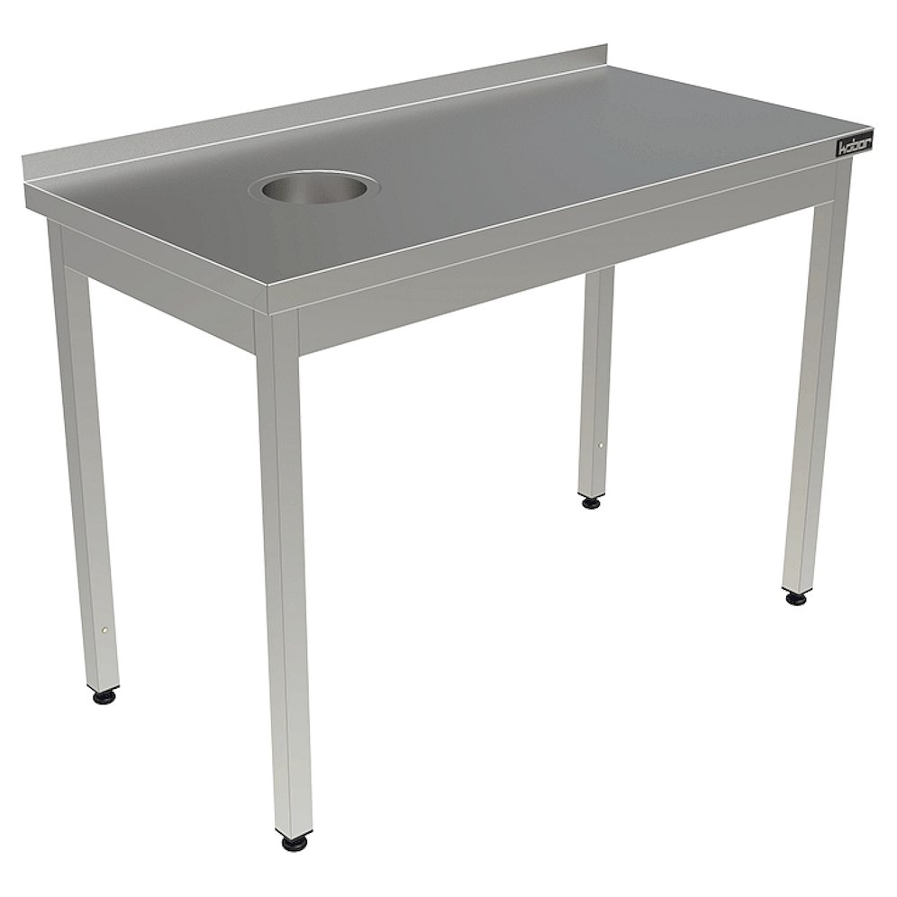 Стол для сбора пищевых отходов Кобор СПОБ-120/60 Л/П имеет столешницу, изготовленную из высококачественной нержавеющей стали, а также во избежание прогибов укрепленную листом ламинированной древесно-стружечной плитой толщиной 16 мм. В столешнице имеется отверстие 150 мм, под которым устанавливают емкость для сбора отходов. Ножки стола исполнены в виде уголка 40х40 мм из оцинкованной стали, также регулируются по высоте во избежание наклона рабочей поверхности.
