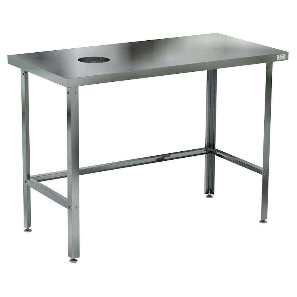 Стол для сбора пищевых отходов Кобор СРО-120/60 имеет столешницу изготовленную из высококачественной нержавеющей стали, а также во избежании прогибов укрепленную листом ламинированной древесно-стружечной плитой толщиной 16 мм. В столешнице имеется отверстие 150 мм, под которым устанавливают емкость для сбора отходов. Ножки стола исполнены в виде уголка 40х40 мм из оцинкованной стали, также регулируются по высоте во избежание наклона рабочей поверхности.