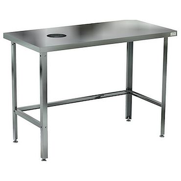 Стол для сбора пищевых отходов Кобор СРО-90/60 имеет столешницу изготовленную из высококачественной нержавеющей стали, а также во избежании прогибов укрепленную листом ламинированной древесно-стружечной плитой толщиной 16 мм. В столешнице имеется отверстие 150 мм, под которым устанавливают емкость для сбора отходов. Ножки стола исполнены в виде уголка 40х40 мм из оцинкованной стали, также регулируются по высоте во избежании наклона рабочей поверхности.