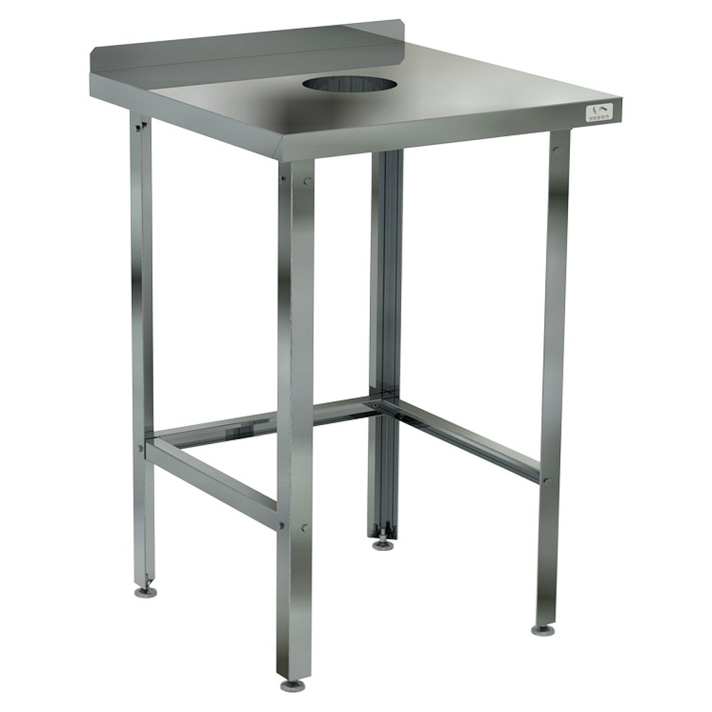 Стол для сбора пищевых отходов Кобор СРОБ-90/60/430 Л/П имеет столешницу, изготовленную из высококачественной нержавеющей стали, а также во избежание прогибов укрепленную листом ламинированной древесно-стружечной плитой толщиной 16 мм. В столешнице имеется отверстие 150 мм, под которым устанавливают емкость для сбора отходов. Ножки стола исполнены в виде уголка 40х40 мм из оцинкованной стали, также регулируются по высоте во избежание наклона рабочей поверхности.