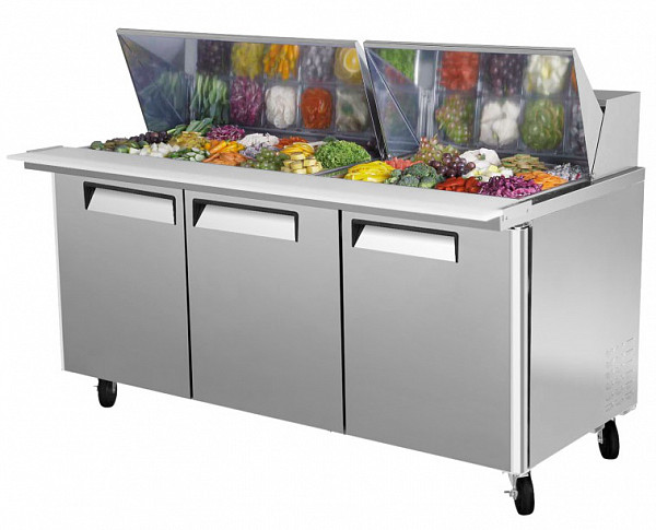 Стол для сэндвичей Turbo air CMST-72-30 используется для кратковременного хранения и нарезки ингридиентов для бургеров и для сборки готовых продуктов на предприятиях общественного питания и торговли. Модель оснащена 3 полками и 4 фронтальными колесами со стопорами. Корпус выполнен из нержавеющей стали (гальванизированная сталь на оборотной стороне и внизу) с применением пожаробезопасных стенок толщиной 60 мм, уплотнения - из АБС-пластика, который улучшает теплоизоляцию и не пропускает конденсат, пол - из нержавеющей стали с алюминиевыми вставками по бокам и сзади оборудования, регулируемые полки - из толстой стальной проволоки с виниловым покрытием, двери собственной конструкции оснащены петлями из высококачественной нержавеющей стали.