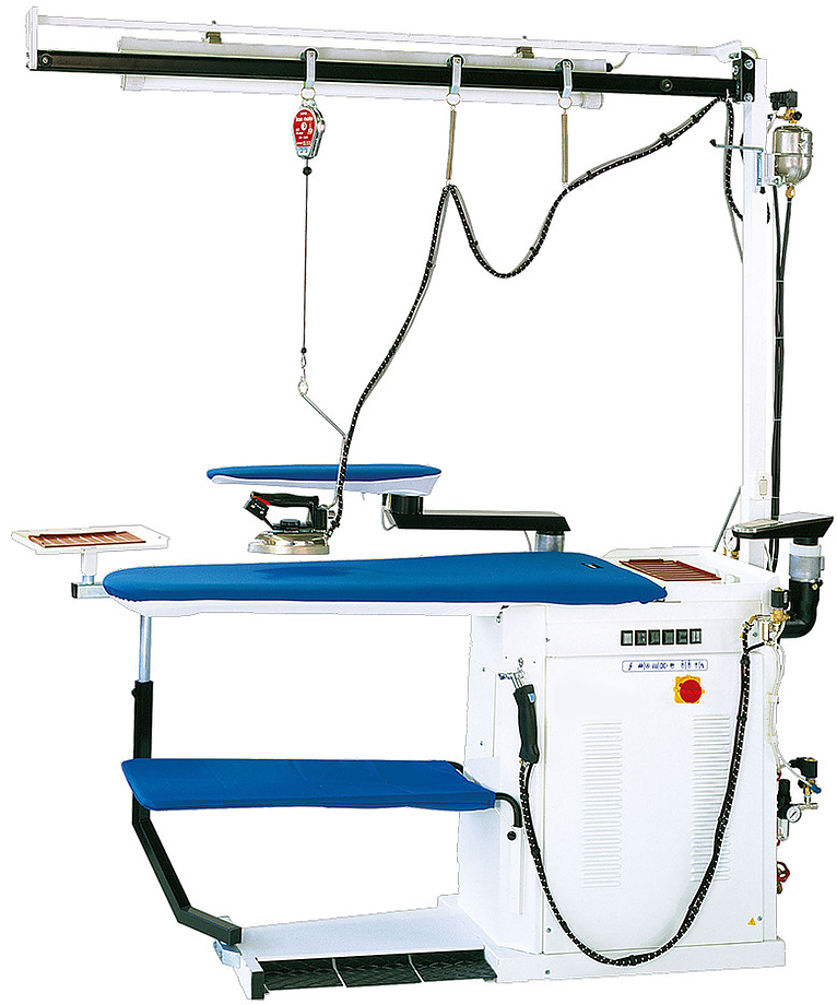 Модель оснащена встроенным парогенератором, поворотной рукавной формой с вакуумом и наддувом и нагревом, блоком подсветки с подвеской утюга и поворотной подставкой для утюга.