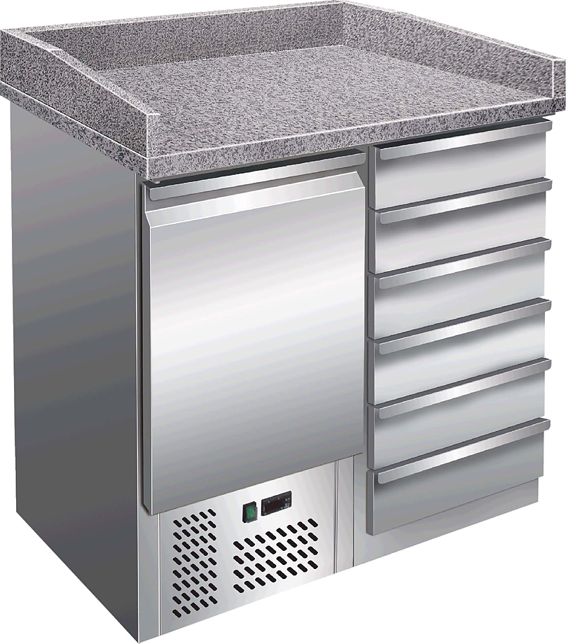 Стол холодильный пиццерийный Koreco SPZ4001 используется на предприятиях общественного питания и торговли для раскатки теста и обработки ингредиентов для приготовления пиццы, охлаждения и кратковременного хранения скоропортящихся продуктов и напитков. Корпус выполнен из нержавеющей стали AISI 304, бортик - из гранита, изоляция - из пенополиуретана.