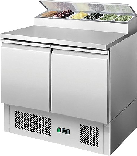Стол холодильный саладетта Koreco PS200 используется на предприятиях общественного питания и торговли для раскатки теста и обработки ингредиентов для приготовления пиццы, салатов, закусок и сэндвичей, охлаждения и кратковременного хранения скоропортящихся продуктов и напитков. Корпус, витрина и ножки выполнены из нержавеющей стали AISI 304.