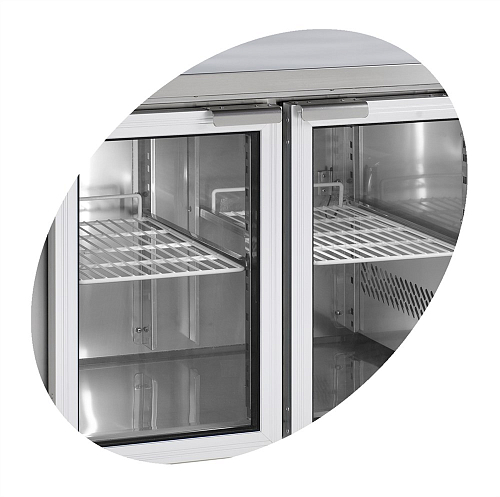 Агрегат оборудован снимаемой столешницей, регулируемыми по высоте ножками и самозакрывающимися дверцами. Корпус и внутренняя обшивка из нержавеющей стали обеспечивают защиту от коррозии. Оборудование оснащено электронным термостатом с дисплеем, вентилируемым охлаждением и градусником. Размораживание происходит автоматически.