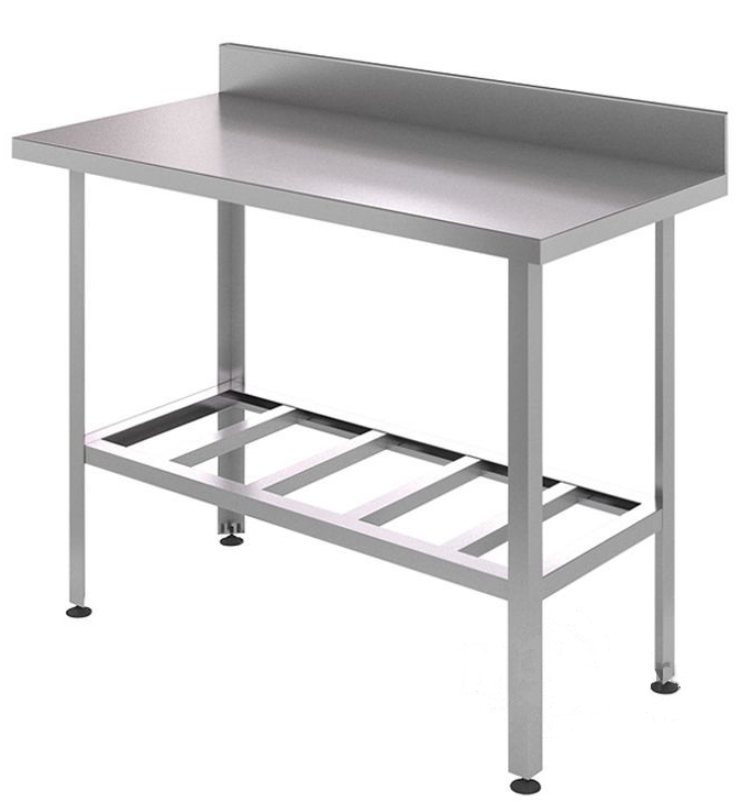 Усиленная сварная конструкция стола изготовлена из нержавеющей стали, столешница с бортом из нержавеющей стали толщиной 1 мм.