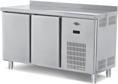 Стол холодильный среднетемпературный с бортом, 2 глухими распашными самозакрывающимися при 45* дверями, правым агрегатом изготовлен из нержавеющей стали.