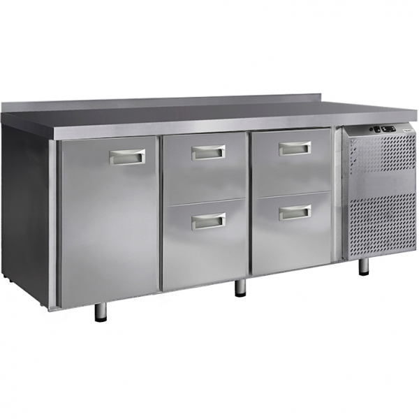 Стол холодильный среднетемпературный, гастронормированный GN1/1, с бортом, изготовлен из нержавеющей стали. Температурный режим: -2/+8С. Стол имеет 1 глухую распашную дверь, 4 выдвижных ящика, вентилируемую систему охлаждения, регулируемые по высоте ножки, микропроцессорный блок управления, автоматическую оттайку испарителя, цельнозаливной корпус. Задняя стенка стола выполнена из оцинкованной стали. Передняя панель моторного отсека имеет большую площадь перфорации, что позволяет обеспечить холодильному агрегату поступление воздуха для охлаждения. Стол может применяться для хранения пищевых продуктов и напитков на предприятиях общественного питания, торговли и пищевых производствах.
