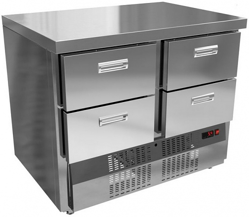 Стол холодильный KRONER СХ 4я-100-70 используется на предприятиях общественного питания и торговли для хранения предварительно охлажденных мясных и рыбных полуфабрикатов, заготовок для салатов, молочной продукции, охлажденных напитков и других пищевых продуктов, а также для приготовления блюд на рабочей поверхности. Модель оснащена расположенным снизу агрегатным отсеком, столешницей без борта, 4 выдвижными ящиками с магнитным уплотнителем и регулируемыми по высоте ножками. Передняя панель моторного отсека имеет большую площадь перфорации, что позволяет обеспечить поступление воздуха для охлаждения. Корпус выполнен из высококачественной нержавеющей стали, задняя стенка - из оцинкованной стали, ручки - из алюминия.