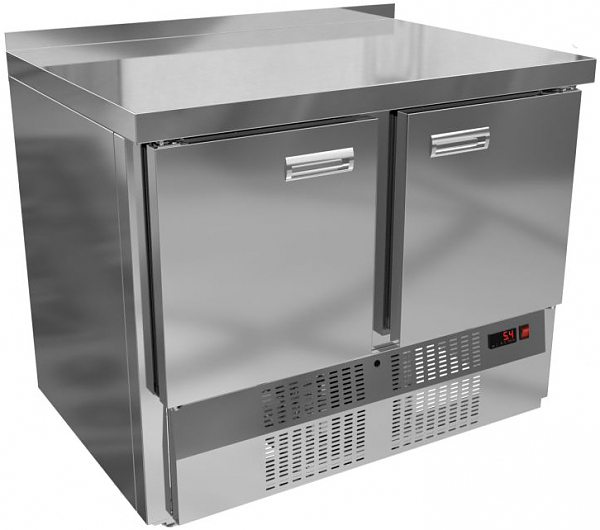 Стол холодильный KRONER СХб 2-100-70 используется на предприятиях общественного питания и торговли для хранения предварительно охлажденных мясных и рыбных полуфабрикатов, заготовок для салатов, молочной продукции, охлажденных напитков и других пищевых продуктов, а также для приготовления блюд на рабочей поверхности. Модель оснащена расположенным снизу агрегатным отсеком, столешницей с бортом, 2 глухими распашными дверьми с магнитным уплотнителем и регулируемыми по высоте ножками. Передняя панель моторного отсека имеет большую площадь перфорации, что позволяет обеспечить поступление воздуха для охлаждения. Корпус выполнен из высококачественной нержавеющей стали, задняя стенка - из оцинкованной стали, ручки - из алюминия.