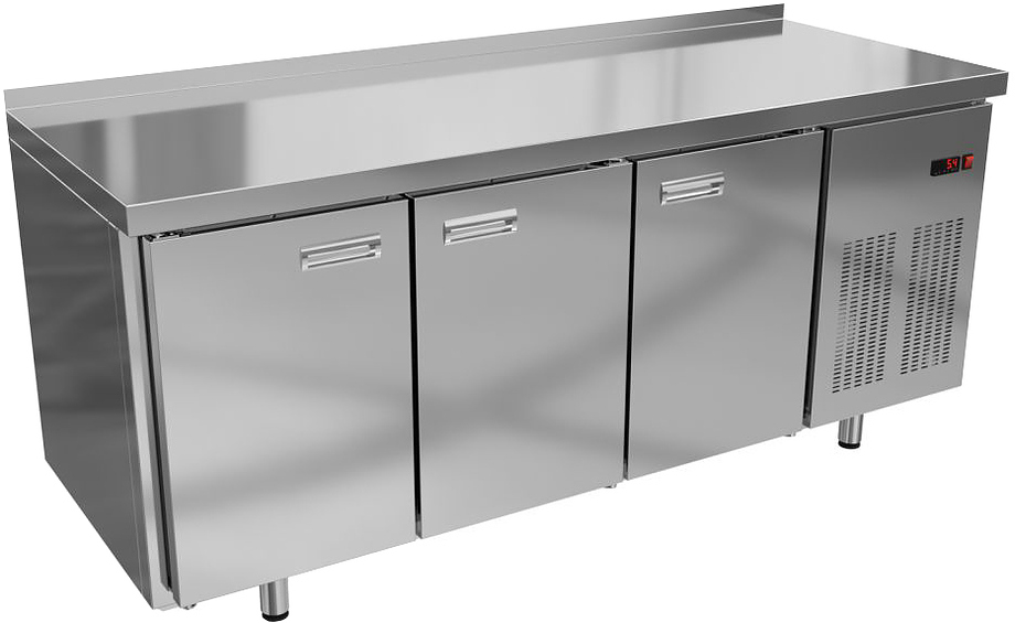 Стол холодильный KRONER СХб 3-180-70 используется на предприятиях общественного питания и торговли для хранения предварительно охлажденных мясных и рыбных полуфабрикатов, заготовок для салатов, молочной продукции, охлажденных напитков и других пищевых продуктов, а также для приготовления блюд на рабочей поверхности. Модель оснащена боковым правым агрегатным отсеком, столешницей с бортом, 3 глухими распашными дверьми с магнитным уплотнителем и регулируемыми по высоте ножками. Передняя панель моторного отсека имеет большую площадь перфорации, что позволяет обеспечить поступление воздуха для охлаждения. Корпус выполнен из высококачественной нержавеющей стали, задняя стенка - из оцинкованной стали, ручки - из алюминия.