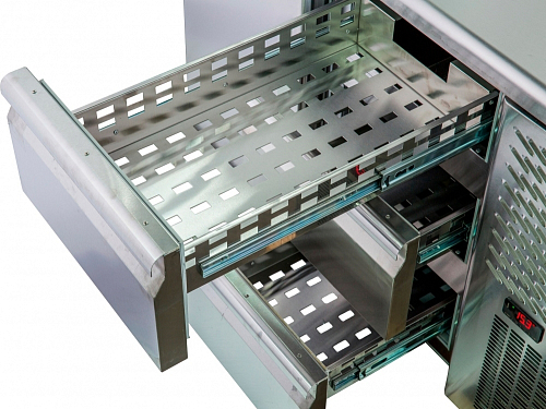 Среднетемпературное изделие оснащено электронным блоком управления, динамическим охлаждением и ящиками на телескопических направляющих.
