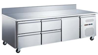 Модель оснащена одной самозакрывающейся глухой дверью с магнитным уплотнителем и четырьмя выдвижными ящиками. Объем стола 417 литров.