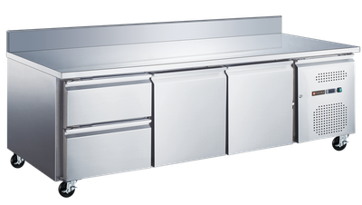 Модель оснащена двумя самозакрывающимися глухими дверями с магнитным уплотнителем и двумя выдвижными ящиками. Объем стола 417 литров.
