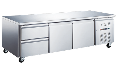 Модель оснащена двумя самозакрывающимися глухими дверями с магнитным уплотнителем и двумя выдвижными ящиками. Объем стола 417 литров.