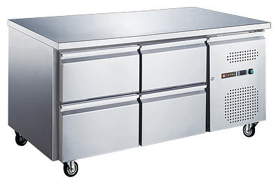 Стол холодильный TATRA TRTGND4 TN предназначен для хранения предварительно охлажденных мясных и рыбных полуфабрикатов, заготовок для салатов, молочной продукции, напитков, а также раскатки теста и обработки пищевых продуктов на предприятиях общественного питания и торговли. Модель оснащена встроенным компрессорным холодильным агрегатом с боковым расположениемодель оснащена встроенным компрессорным холодильным агрегатом с боковым расположением, электронным контроллером с цифровым дисплеем индикации на фронтальной панели, столешницей, холодильной камерой с 2 секциями, каждая секция оснащена 2 выдвижными ящиками. Корпус выполнен из высококачественной нержавеющей стали.