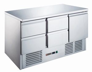 Модель оснащена одной глухой дверью с магнитным уплотнителем и четырьмя ящиками. Объем стола 368 литров.
