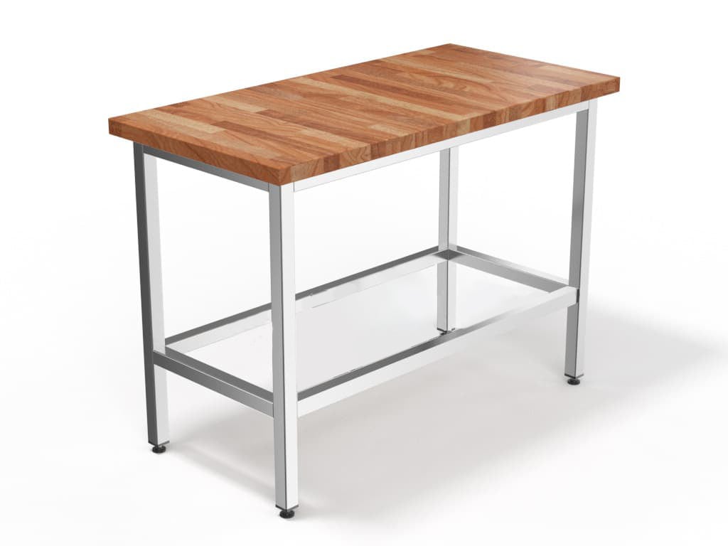 Столешница из наборного бука установлена на разборный каркас с обвязкой, выполненный из нержавеющей трубы (сталь AISI 430) 40 × 40 мм.
