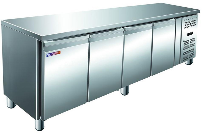 Стол имеет четыре дверки для доступа в пространство полезного объема. Внутри стола расположен воздухоохладитель с вентиляторами, которые обеспечивают равномерное и быстрое распределение холодного воздуха внутри полезного объема стола. В полезном объеме предусмотрены полки-решетки для укладки продуктов в герметичной упаковке.