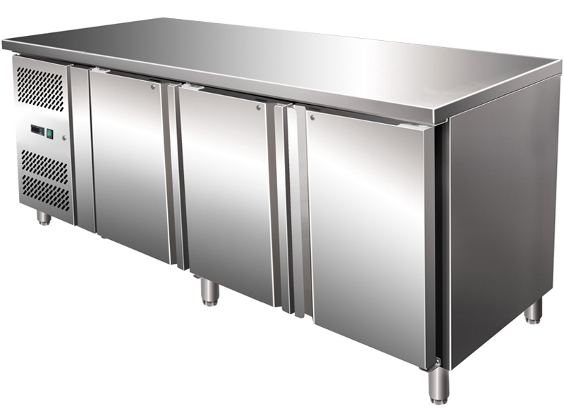 Корпус стола изготавливается из стали, поверхности скругленные, дно вогнутое, что исключает накапливание остатков пищевых продуктов и максимально упрощает поддержание аппарата в соответствии с гигиеническими нормами. Полки стола соответствуют формату гастроемкостей GN 1х, контур охлаждения конденсатора дает возможность установить стол к стене без снижения производительности. В комплекте идут ножки из стали с регулировкой по высоте и три полки.