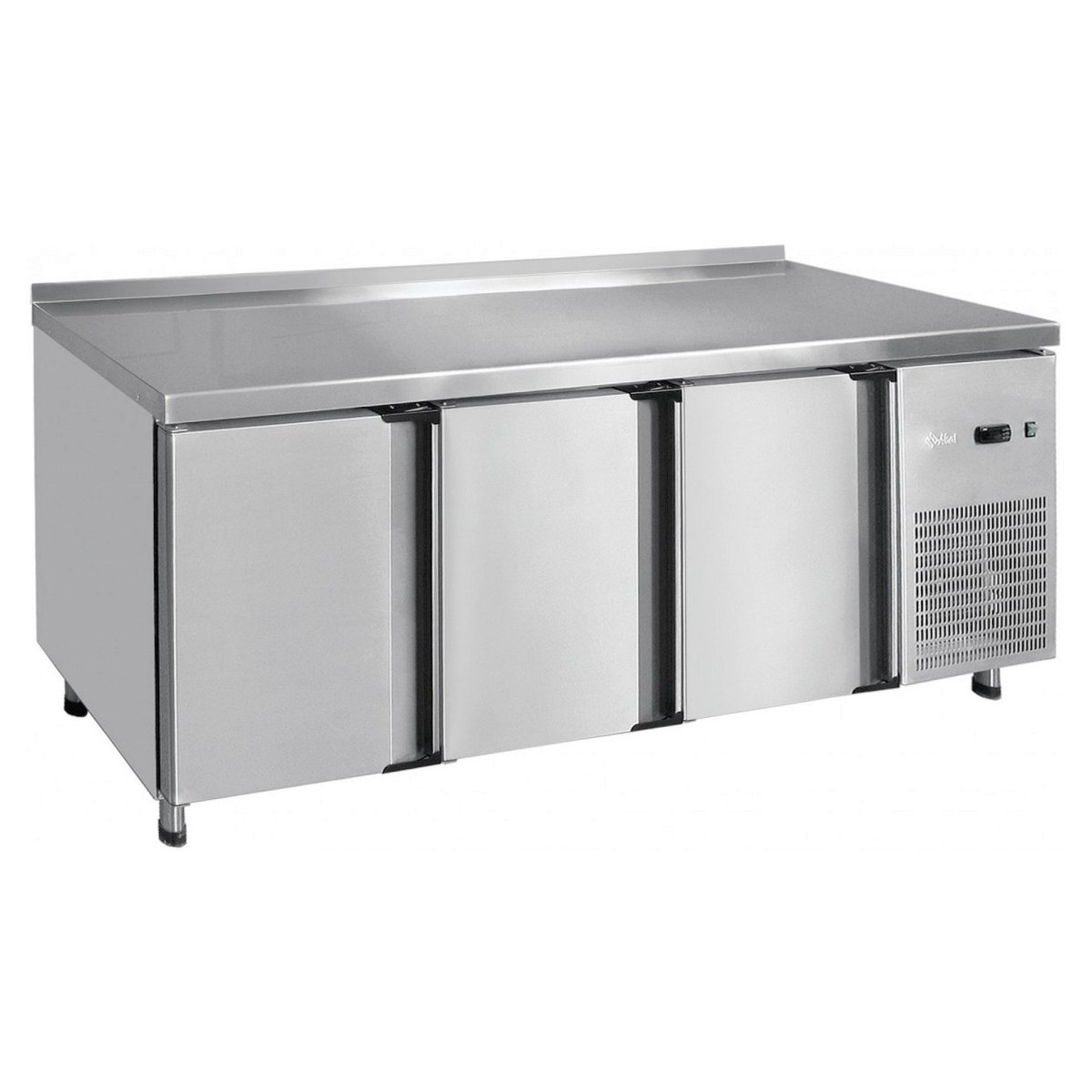Может использоваться как самостоятельно, так и встраиваться в барные стойки. Рабочий диапазон температуры внутри камеры от -2 до +8 С. Имеет три распашные дверки. Охлаждаемый рабочий объем (0,46 м3) имеет три полки-решетки, с возможностью регулировки их по высоте. Поверхность стола - не охлаждаемая ровная поверхность с бортом. Все стенки и полости стола изготовлены методом заливки пенополиуретаном. Используемый хладагент - R404A. Стол имеет регулируемые по высоте ножки.