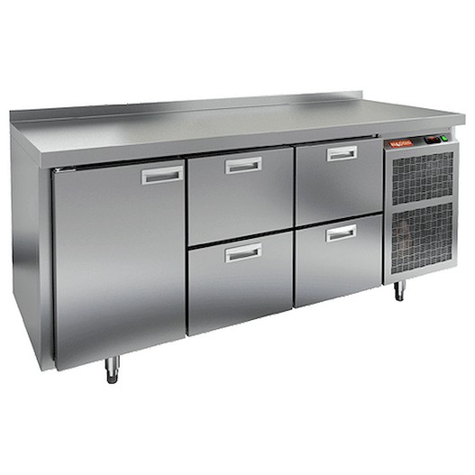 Охлаждаемый стол HICOLD GN 122/TN выполнен из нержавеющей стали марки AISI-304. Верх стола накрыт столешницей. Пространство между внутренней и наружной стенкой заполнено пеной-теплоизолятором. Охлаждаемый стол HICOLD GN 122/TN имеет одну распашную дверку и четыре выдвижных ящика для доступа в пространство полезного объема. Внутри стола расположен воздухоохладитель с вентиляторами, которые обеспечивают равномерное и быстрое распределение холодного воздуха внутри полезного объема стола. В полезном объеме предусмотрены полки-решетки для укладки продуктов в герметичной упаковке. Полки, направляющие полок и стойки выполнены по стандарту GN – полная совместимость с комплексом профессионального кухонного оборудования. Нагрузка до 50 кг на каждую полку.