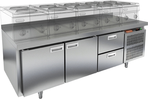 Агрегат выполнен из нержавеющей стали и оснащен выдвижными ящиками.
