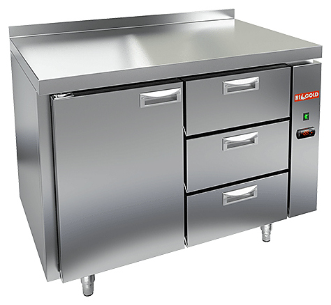 Охлаждаемый стол под выносное хладоснабжение HICOLD GN 13/TN P выполнен из нержавеющей стали марки AISI-304, которая полностью соответствует санитарным нормам. Верх стола накрыт столешницей. Пространство между внутренней и наружной стенкой заполнено пеной-теплоизолятором. Охлаждаемый стол HICOLD GN 13/TN P имеет одну распашную дверку и три выдвижных ящика для доступа в пространство полезного объема. В полезном объеме предусмотрены полки-решетки для укладки продуктов в герметичной упаковке. Полки, направляющие полок и стойки выполнены по стандарту GN – полная совместимость с комплексом профессионального кухонного оборудования. Нагрузка до 50 кг на каждую полку.