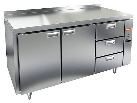 Охлаждаемый стол под выносное хладоснабжение HICOLD SN 113/TN P выполнен из нержавеющей стали марки AISI-304, которая полностью соответствует санитарным нормам. Верх стола накрыт столешницей. Пространство между внутренней и наружной стенкой заполнено пеной-теплоизолятором. Охлаждаемый стол HICOLD SN 113/TN P имеет две распашные дверки и три выдвижных ящика для доступа в пространство полезного объема. В полезном объеме предусмотрены полки-решетки для укладки продуктов в герметичной упаковке. Нагрузка до 50 кг на каждую полку.