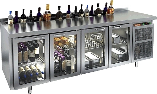 Охлаждаемый стол с ванной для льда под бутылки HICOLD SNG 1111 HT V выполнен из нержавеющей стали марки AISI-304, которая полностью соответствует санитарным нормам. Верх стола накрыт столешницей. Пространство между внутренней и наружной стенкой заполнено пеной-теплоизолятором. Охлаждаемый стол HICOLD SNG 1111 HT V имеет четыре распашные стеклянные дверки для доступа в пространство полезного объема. Внутри стола расположен воздухоохладитель с вентиляторами, которые обеспечивают равномерное и быстрое распределение холодного воздуха внутри полезного объема стола. В полезном объеме предусмотрены полки-решетки для укладки продуктов в герметичной упаковке. Нагрузка до 50 кг на каждую полку.