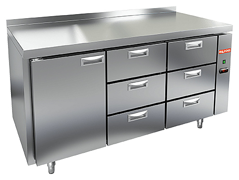 Верх стола накрыт столешницей. Пространство между внутренней и наружной стенкой заполнено пеной-теплоизолятором. Охлаждаемый стол HICOLD GN 133/TN P имеет одну распашную дверку и шесть выдвижных ящиков для доступа в пространство полезного объема. В полезном объеме предусмотрены полки-решетки для укладки продуктов в герметичной упаковке. Полки, направляющие полок и стойки выполнены по стандарту GN – полная совместимость с комплексом профессионального кухонного оборудования. Нагрузка до 50 кг на каждую полку.
