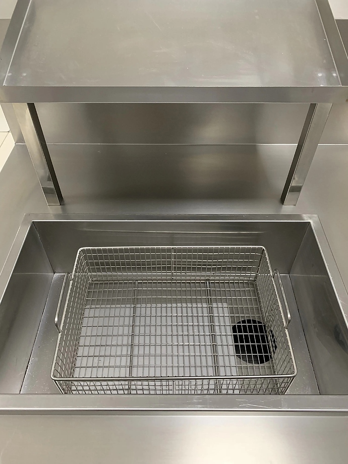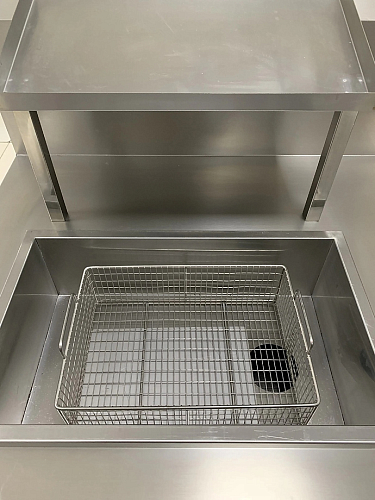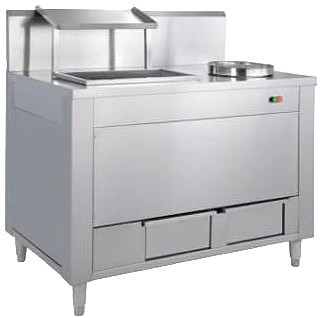 Модель оснащена панировочным бассейном в левой части стола и емкостью для специй, расположенной с правой стороны. Корпус выполнен из стали.