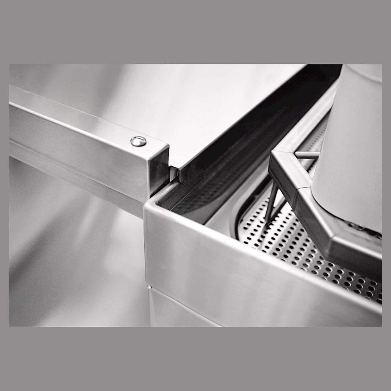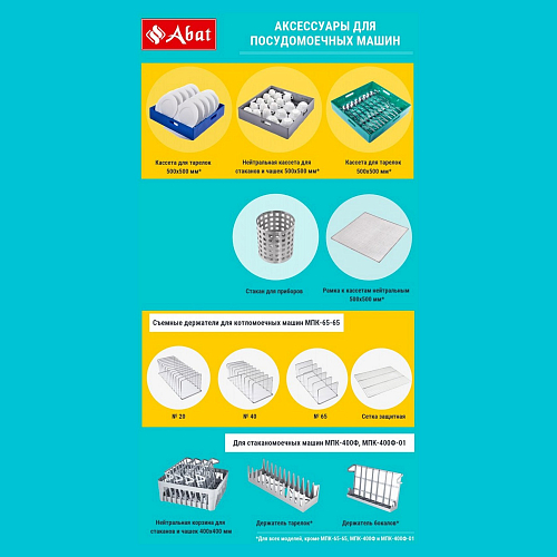 В столе предмоечном Abat СПМП-6-3 имеются цельнотянутая ванна для ополаскивания посуды (размеры 400х400х250 мм), душирующее устройство для холодной и горячей воды, направляющие для установки четырех кассет 500х500 мм.