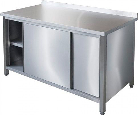 Столешница изготовлена из прочной нержавеющей стали. Столешница усилена двойной ламинированной ДСП. Объемный борт. Жесткость полки для инвентаря обеспечивается ребром. Ножки регулируются по высоте. На дверях-купе возможна установка замка. Стол поставляется в собранном виде.