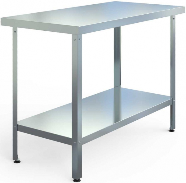 Стол производственный Assum СП-П-14/6 (1400х600х850) без борта, оснащён рамкой столешницы из оцинкованной стали толщиной 1,5мм, сплошной нижней полкой из нержавеющей стали AISI 430 толщиной 0,7мм. Столешница из AISI 430 толщиной 0,7мм усилена ламинированным ДСП толщиной 16мм. Максимальная равномерно распределенная нагрузка на столешницу - до 150кг. Полка усилена рёбром жесткости из нержавеющей стали толщиной 0,7мм. Ножки стола изготовлены из нержавеющей стали AISI 430 (уголок 40х40мм) толщиной 1,5мм. Регулируемые по высоте пластиковые опоры позволяют компенсировать неровности пола. Отступ ног - 50мм.