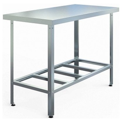 Стол производственный сборно-разборный открытый центральный, серии Standart, без борта, со столешницей из пищевой шлифованной нержавеющей стали AISI430 толщиной 0,7мм оснащён подложкой из ламинированного ДСП толщиной 16мм, рамкой столешницы из оцинкованной стали толщиной 1,5мм, Z-образными креплениями столешницы из нержавеющей стали толщиной 0,7мм, нижней полкой-решеткой из оцинкованной стали толщиной 0,7мм, разборным каркасом из оцинкованного гнутого углового профиля 40х40мм толщиной 1,5мм, регулируемыми по высоте пластиковыми опорами ножек. Максимальная равномерно распределенная нагрузка на столешницу - до 150кг.
