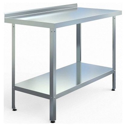 Стол производственный сборно-разборный открытый пристенный, серии Standart, с бортом высотой 45мм, столешницей из пищевой шлифованной нержавеющей стали AISI430 толщиной 0,7мм оснащён подложкой из ламинированного ДСП толщиной 16мм, рамкой столешницы из оцинкованной стали толщиной 1,5мм, Z-образными креплениями столешницы из нержавеющей стали толщиной 0,7мм, нижней сплошной полкой из оцинкованной стали толщиной 0,7мм, разборным каркасом из оцинкованного гнутого углового профиля 40х40мм толщиной 1,5мм, регулируемыми по высоте пластиковыми опорами ножек. Максимальная равномерно распределенная нагрузка на столешницу - до 150кг.