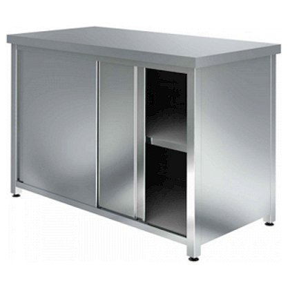 Стол производственный закрытый, серии Стандарт, без борта, с дверями-купе, промежуточной сплошной полкой, сварным каркасом - универсальное нейтральное оборудование для профессиональной кухни кафе, столовой, ресторана. Удобство конструкции заключается в том, что столешница используется для разделки продуктов (фруктов, овощей, мяса, рыбы), приготовления блюд, а в тумбе хранится посуда и прочий инвентарь. Столешница и двери изготовлены из нержаеющей стали AISI 430 толщиной 0,7мм. Нагрузка на столешницу - до 120кг. Боковые и задняя стенки, дно, сплошная полка, усиление полки и дна изготовлены из оцинкованной стали толщиной 0,7мм. Ножки стола изготовлены из оцинкованной стали (уголок 40х40 мм) толщиной 1,5мм. Отступ ног - 15мм. Регулируемые по высоте пластиковые опоры позволяют компенсировать неровности пола.