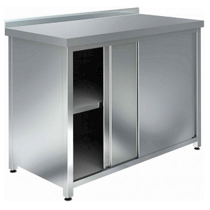Стол производственный закрытый, серии Премиум, с бортом высотой 45мм, дверями-купе, промежуточной сплошной полкой, сварным каркасом, изготовлен из нержавеющей стали AISI 430. Столешница из AISI 430 толщиной 0,7мм усилена ламинированным ДСП толщиной 16мм. Нагрузка на столешницу - до 120кг. Боковые стенки, двери, дно, сплошная полка, усиление полки (ребро жесткости) изготовлены из нержавеющей стали AISI 430 толщиной 0,7мм. Ножки стола изготовлены из квадратной трубы сечением 40х40мм, из нержавеющей стали AISI 430 толщиной 1,2мм. Регулируемые по высоте пластиковые опоры позволяют компенсировать неровности пола. Стол-тумба - универсальное нейтральное оборудование для профессиональной кухни кафе, столовой, ресторана. Удобство конструкции заключается в том, что столешница используется для разделки продуктов (фруктов, овощей, мяса, рыбы), приготовления блюд, а в тумбе хранится посуда и прочий инвентарь.
